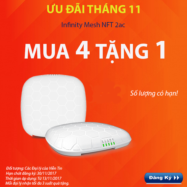 - Với mục tiêu đưa sản phẩm chất lượng – giá thành hợp lý đến với người tiêu dùng, Tháng 11/2017 vừa qua Viễn Tin đã hợp tác với hãng LigoWave để triển khai Sự kiện Ưu đãi đặc biệt “ Mua 4 tặng 1” đối với dòng sản phẩm Infinity Mesh NFT 2AC.