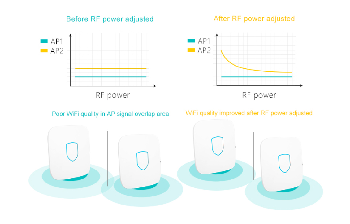 Giảm Công suất phát khi mật độ người dùng hoặc AP cao, tăng công suất phát khi phủ diện tích lớn để cái thiện cường độ sóng