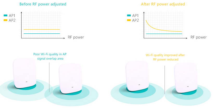 Giảm công suất phát khi mật độ người dùng hoặc AP cao, tăng công suất phát khi phủ diện tích lớn để cái thiện cường độ sóng