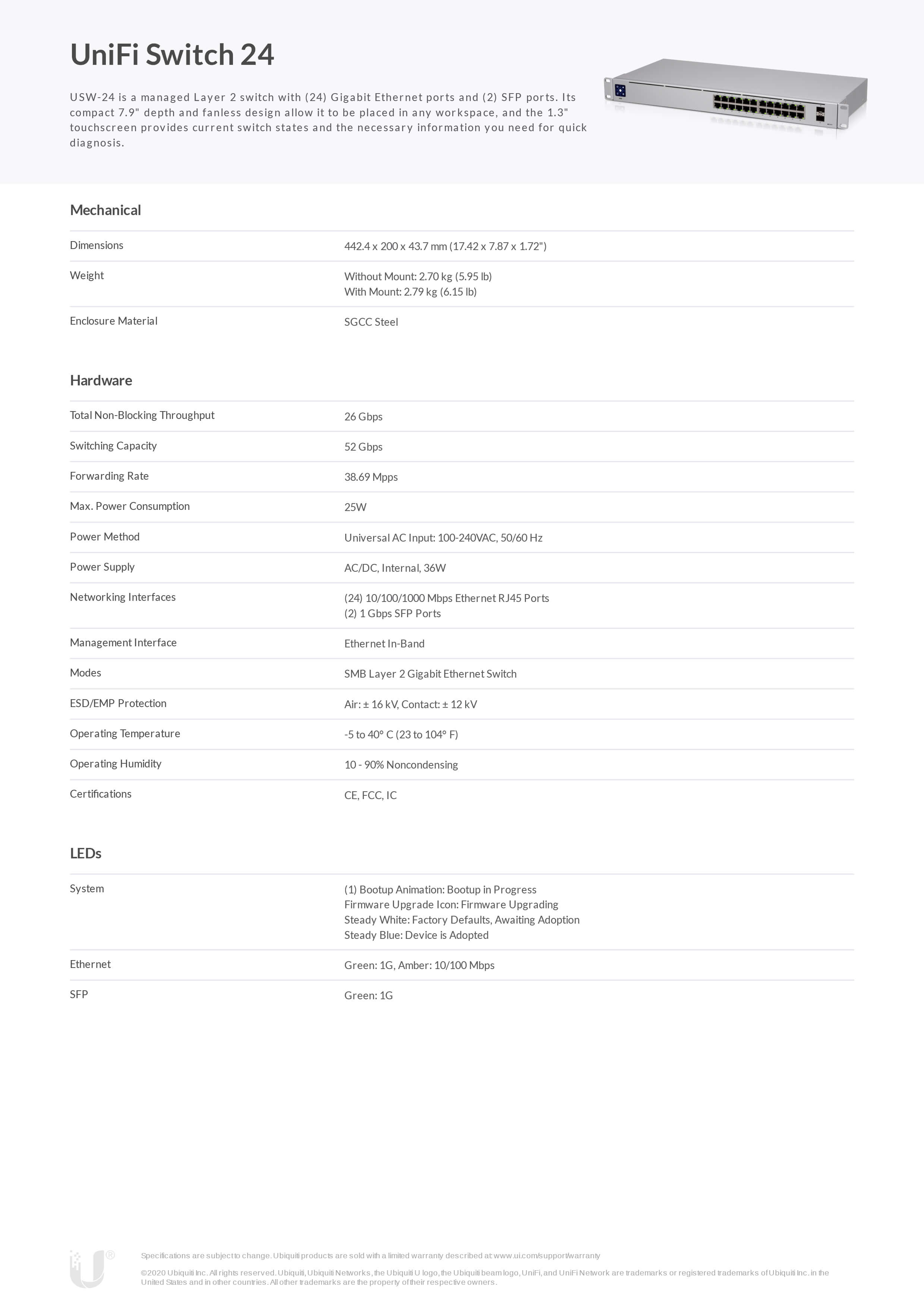 (24) 10/100/1000 Mbps Ethernet RJ45 Ports (2) 1 Gbps SFP Ports |